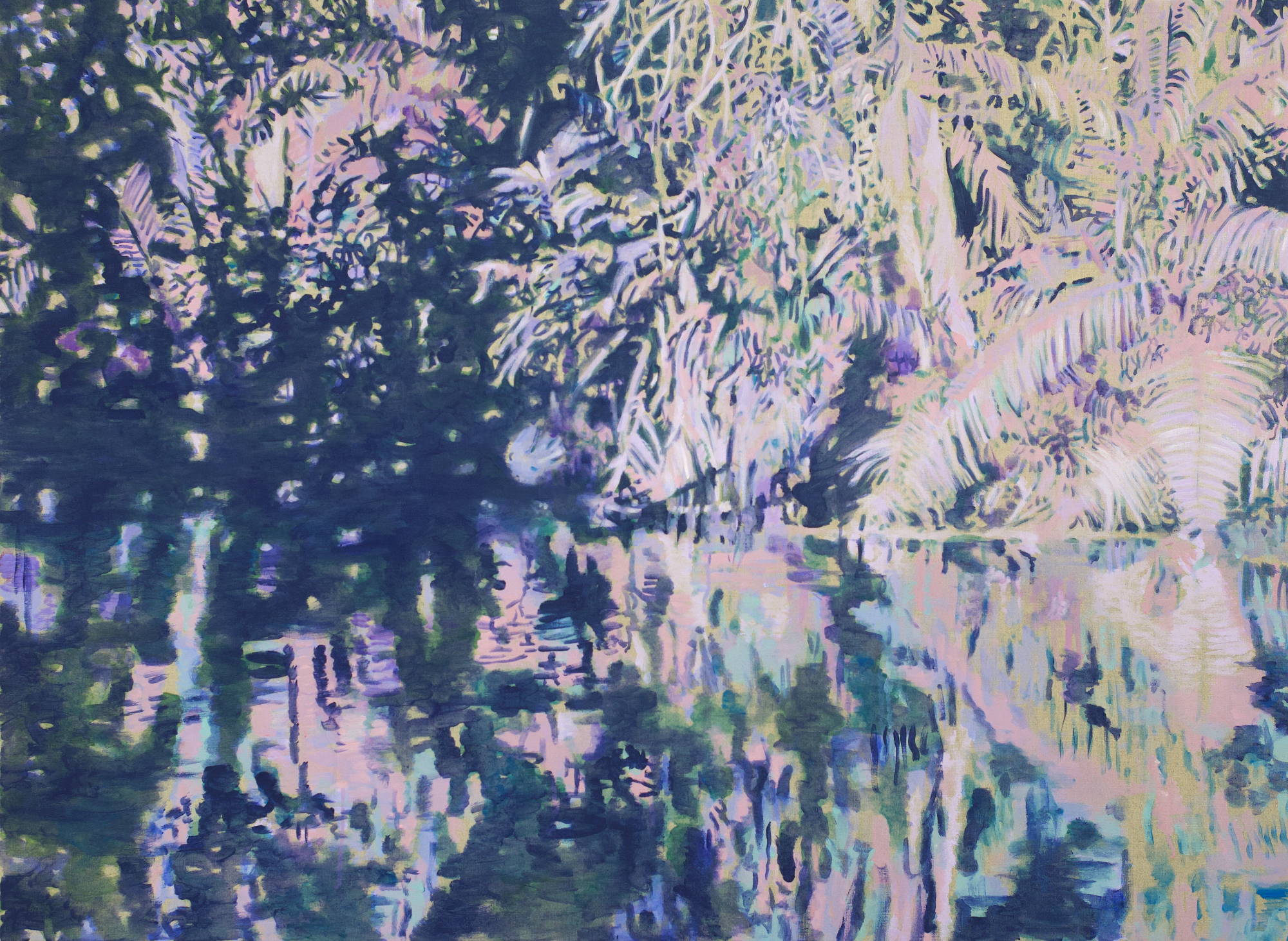 De schilderijen zijn geen letterlijke weergaven van deze omgeving. In plaats daarvan tonen ze een verinnerlijkt landschap, opgebouwd uit kleurvelden, lichtflarden en spiegelingen. Vormen verschijnen en verdwijnen, perspectieven verschuiven. Het beeld blijft in beweging en onttrekt zich aan een vaste interpretatie.